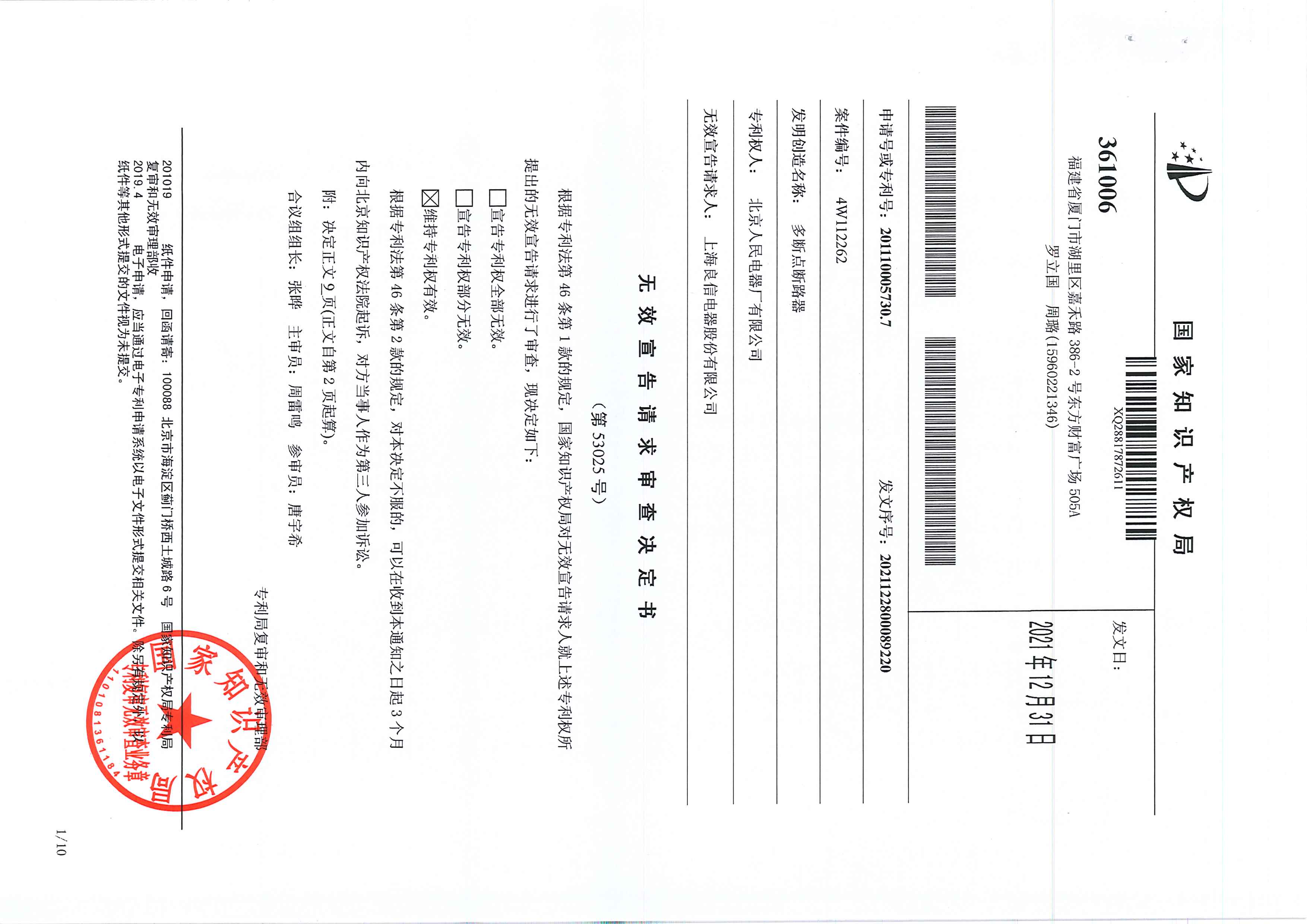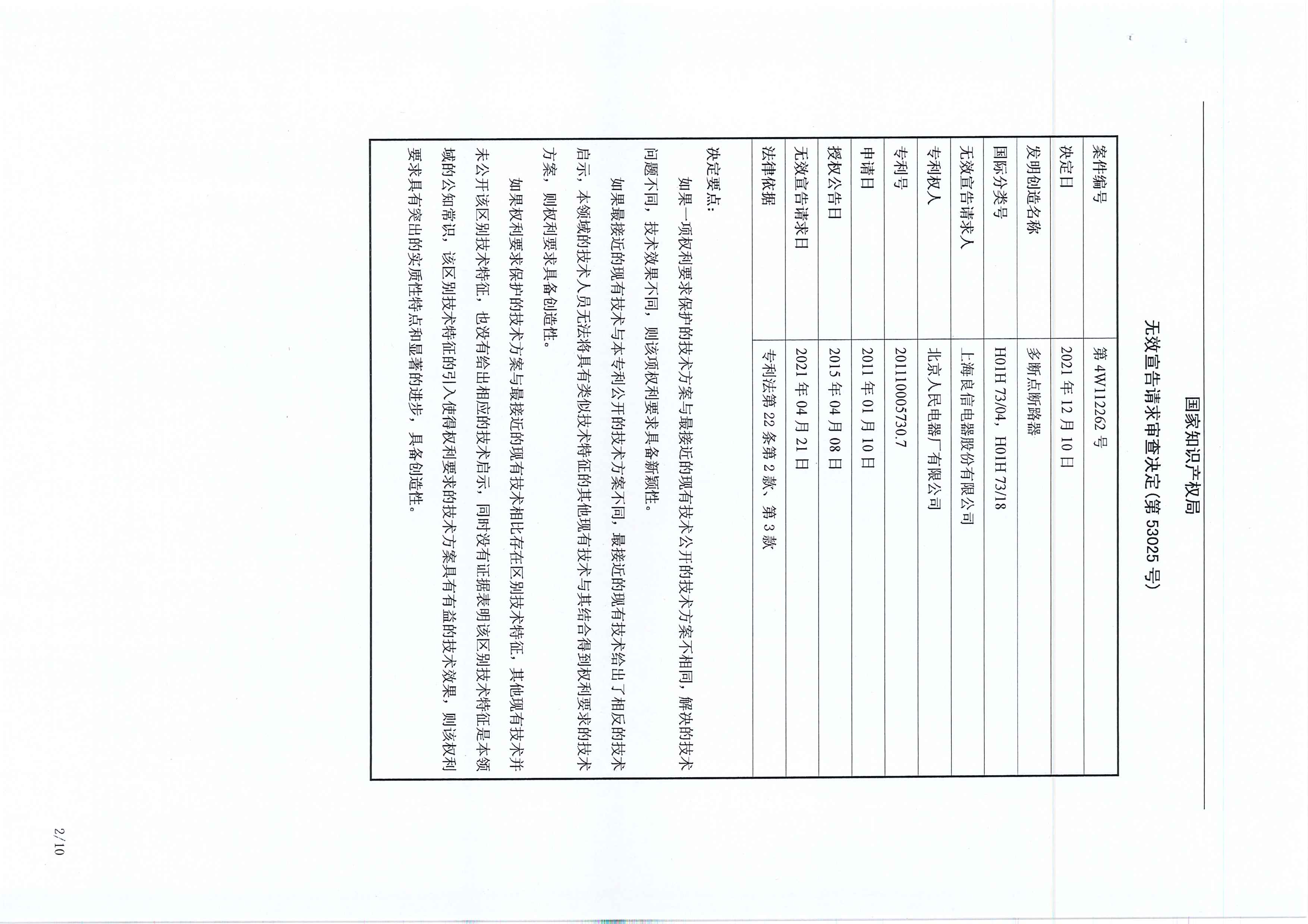 人民電器2011100057307無(wú)效宣告請(qǐng)求審查決定書-贏