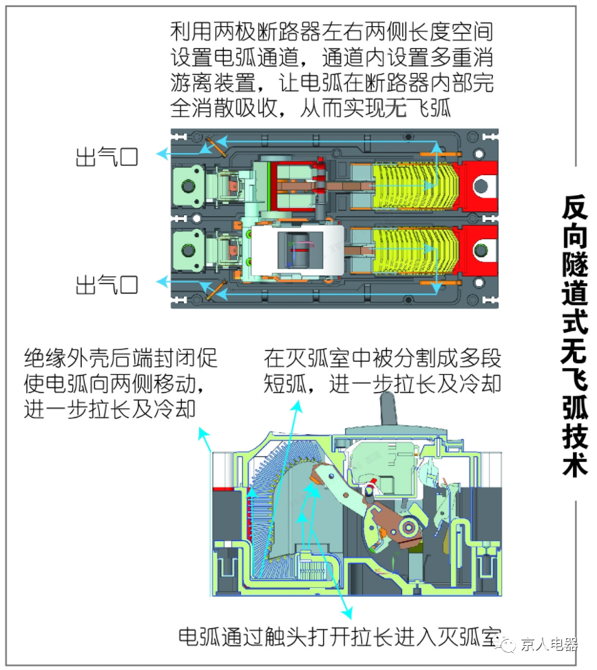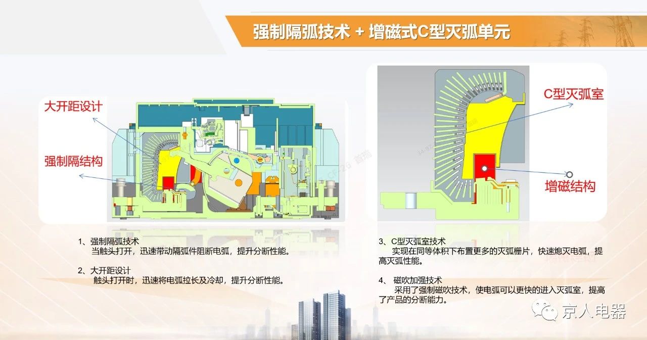 ● Innovation point 1: Forced isolation technology, when the contact is opened, quickly drives the arc isolating component to block the arc, improving the breaking ability.